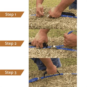 1. Du fører båndet rundt om høballen og klikker det fast med karabinhagerne