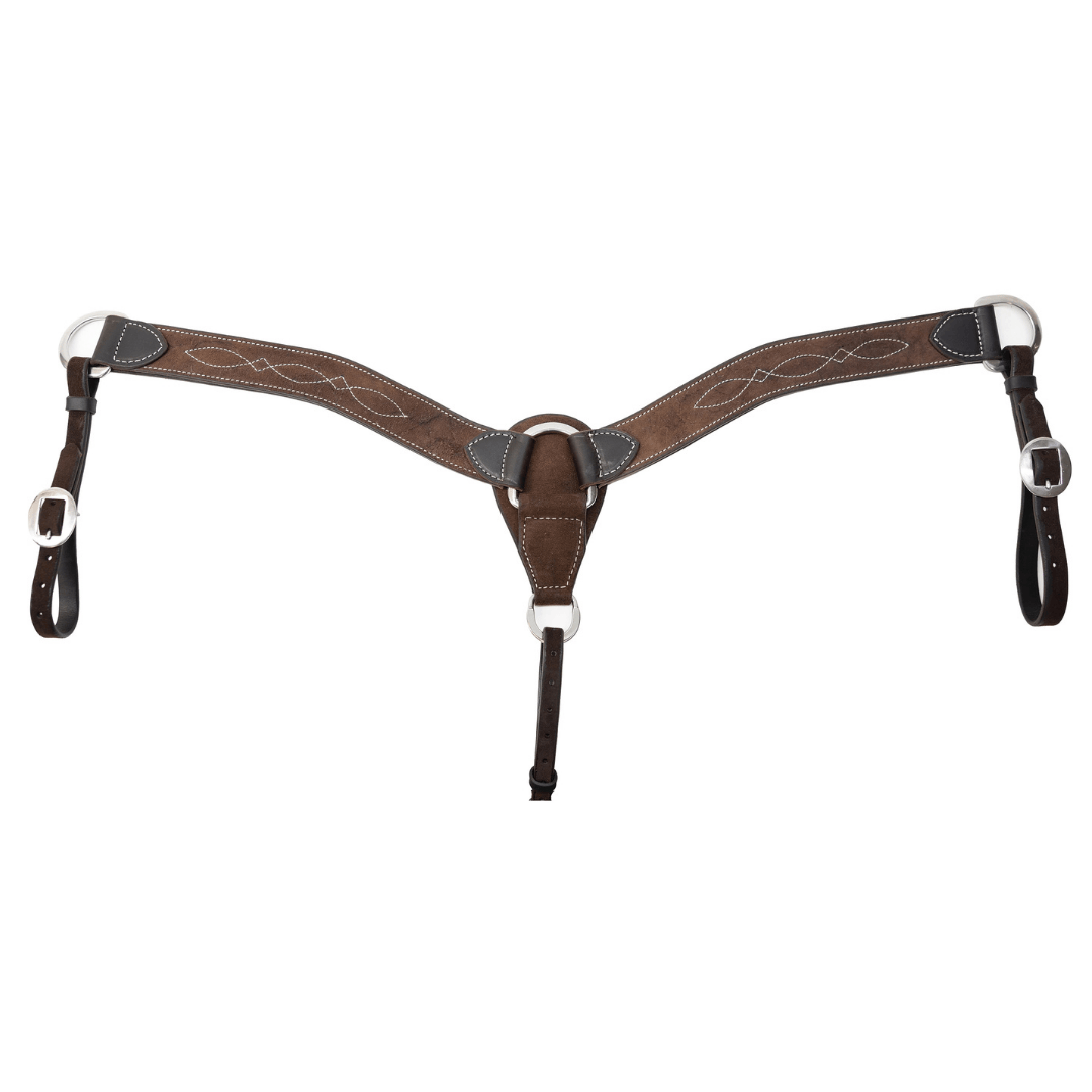 Prof. Choice Contoured Breast Collar i chocolate roughout læder med 2" bredde, rustfri hardware og anatomisk pasform til stabilitet og westernridning.