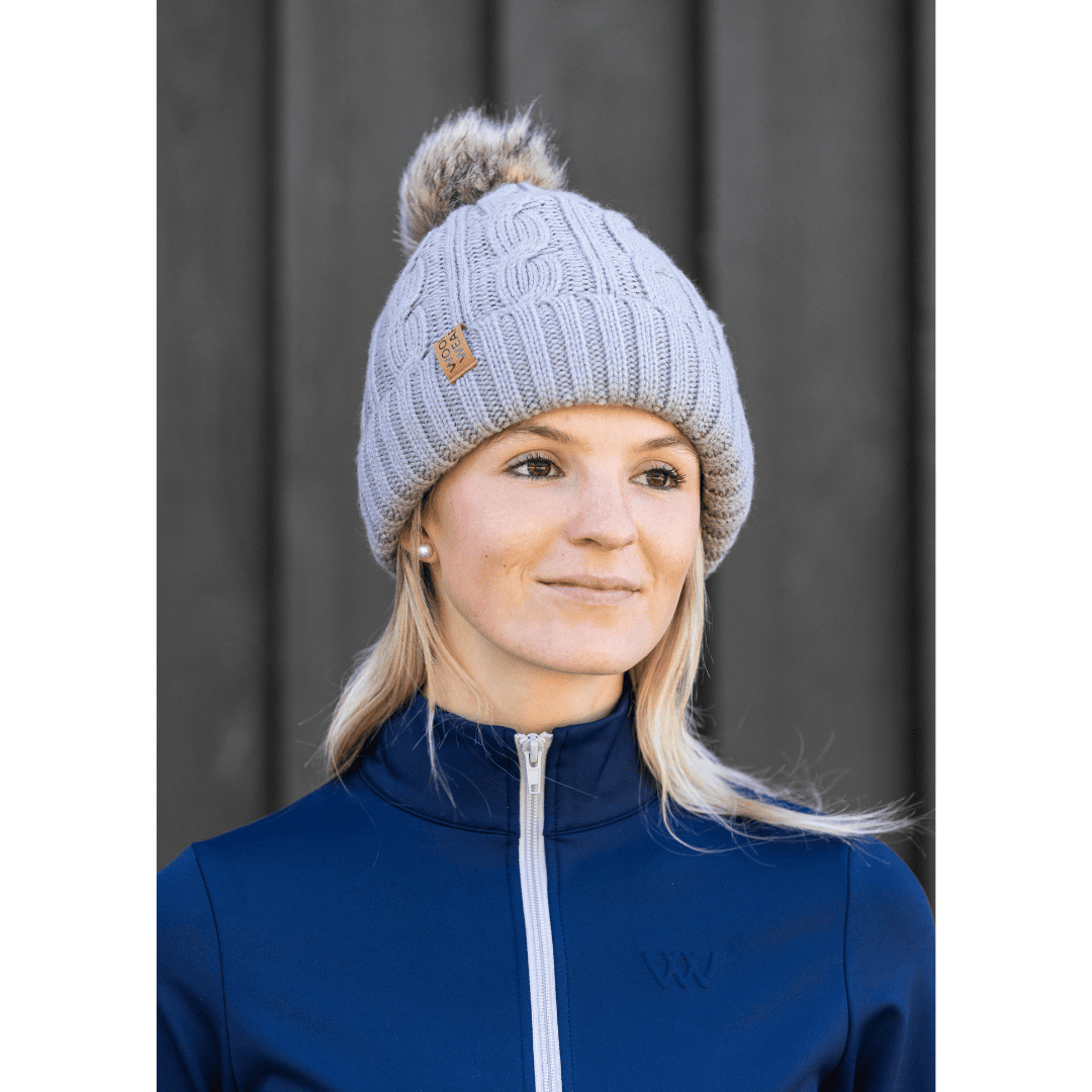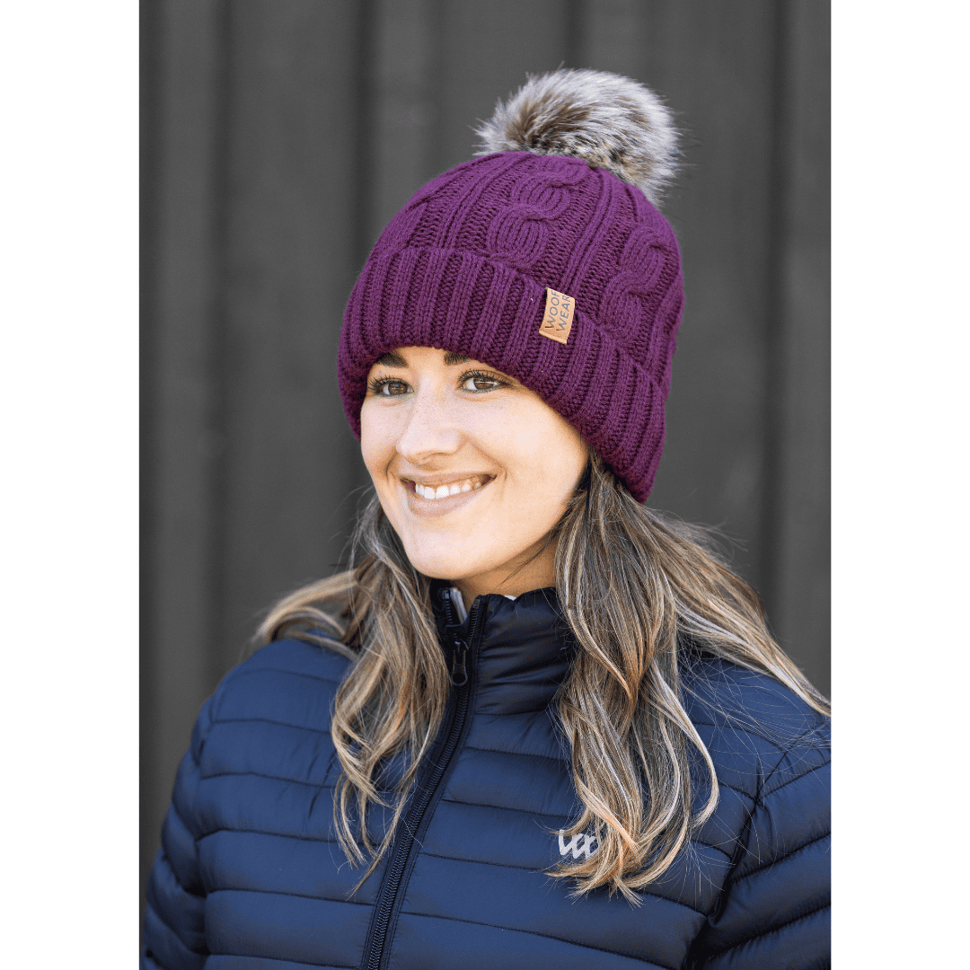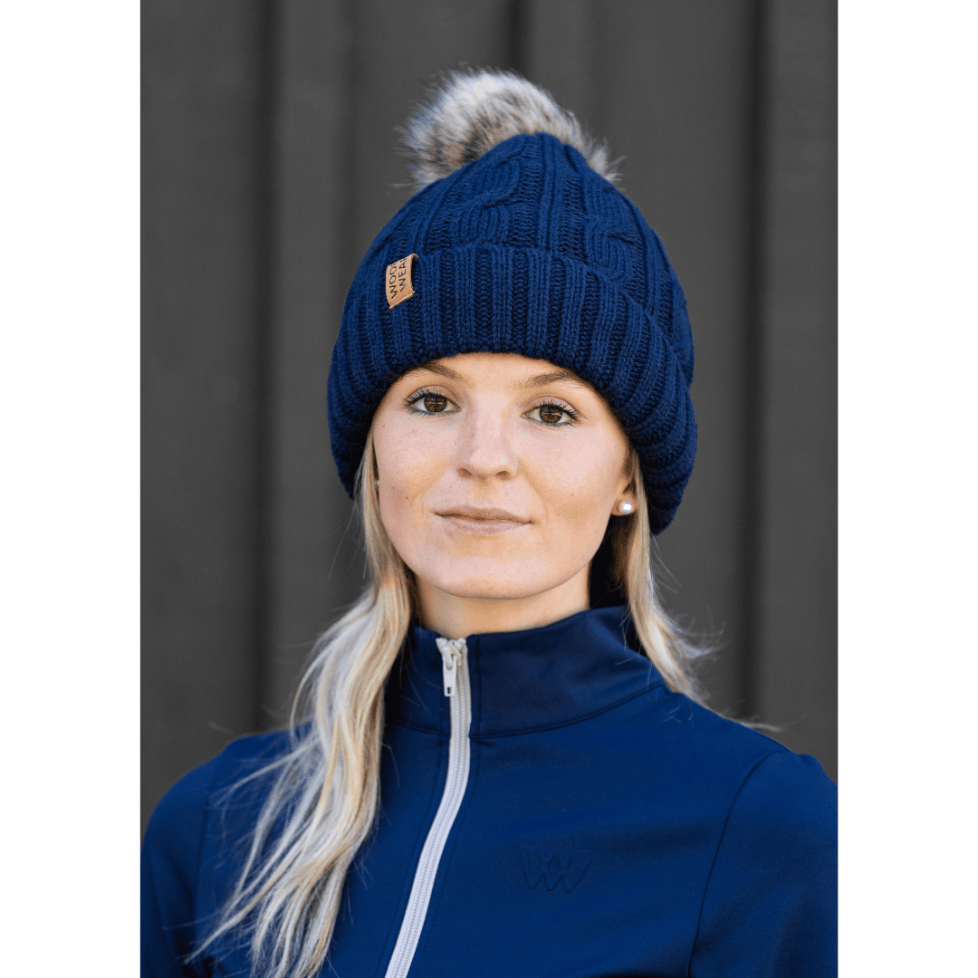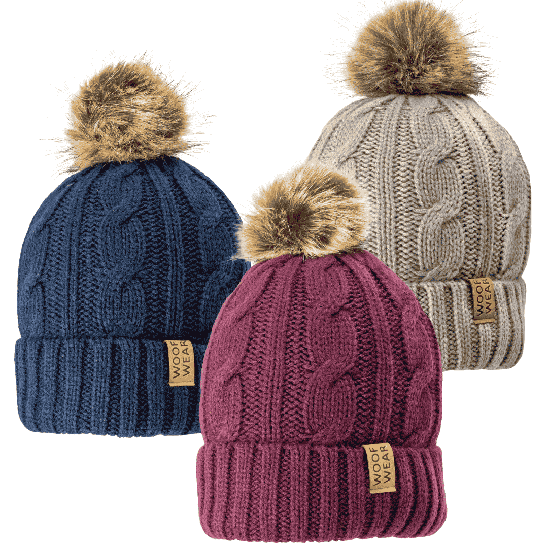 Kabelstrikket Woof Wear hue med blød fleeceforing, faux fur‑pom og faux‑læder badge. Varm, stilren og alsidig i farverne Stone, Navy og Plum.