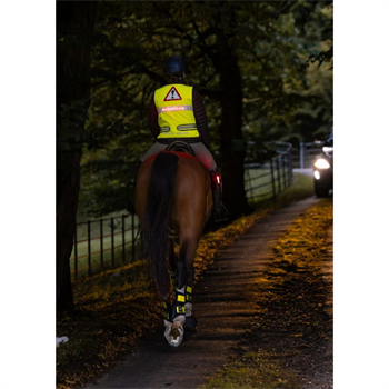 Hi‑vis ridevest med front‑LED (hvid), ryg‑LED (rød), reflekser og vandafvisende stof. 3 lysprogrammer, letvægt og justerbar.