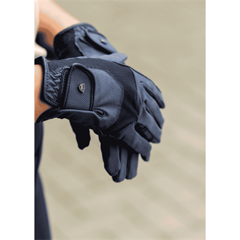 Ultralet ridehandske i navy med Reintex®-håndflade for suverænt greb og føling. Pro‑Mesh overdel ventilerer effektivt; forstærket ved tøjlefingre og fingerspidser.