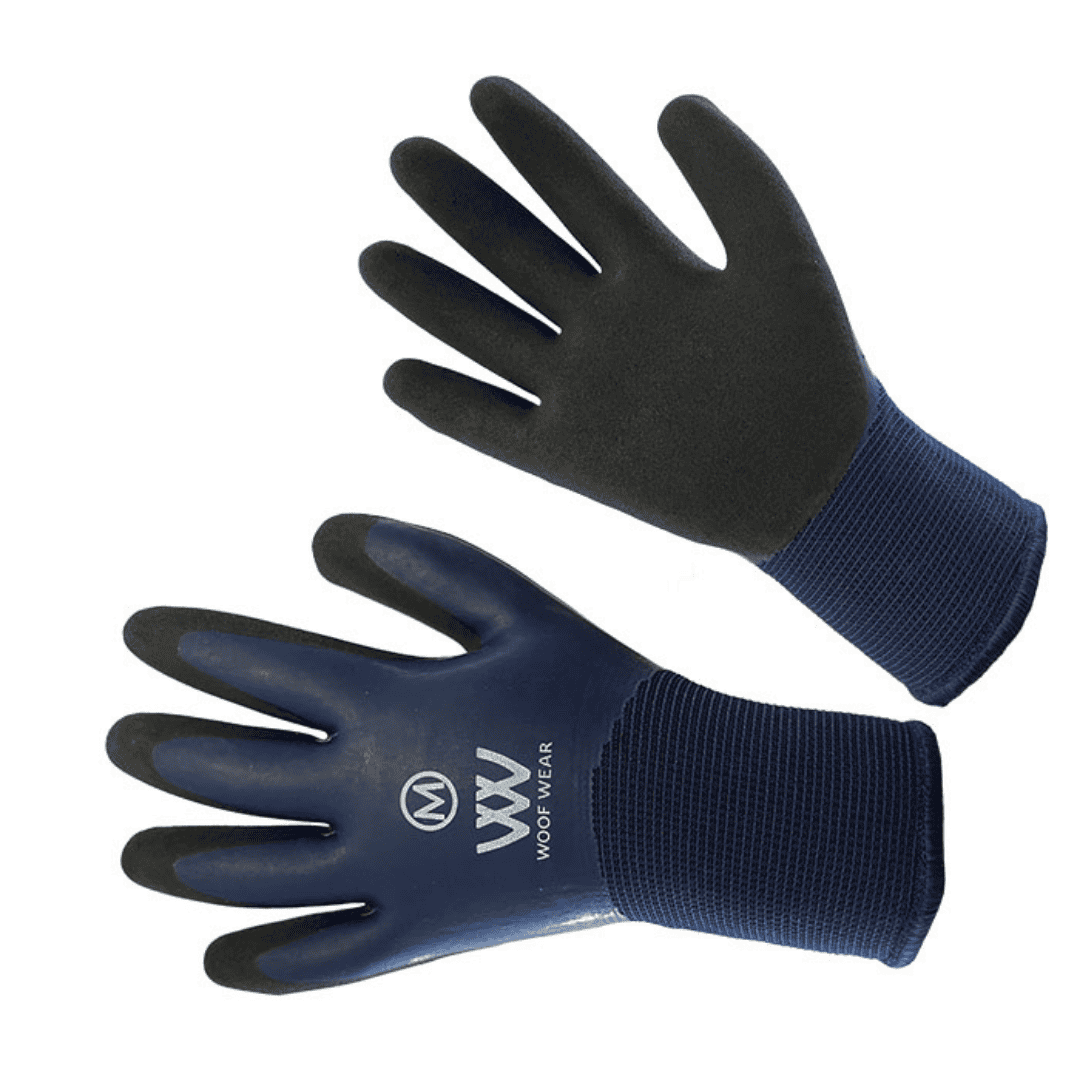 Woof Wear All Season Yard Glove – Sort er den alsidige, vandtætte arbejdshandske, som staldfolk og ryttere bruger dag efter dag. En robust belægning danner en fleksibel, næsten sømløs barriere mod vand, olie og snavs, så du kan løfte, trække, trille og feje uden at miste greb – selv når underlaget er vådt og glat. Den tætte pasform bevarer fingerfærdigheden til små opgaver som at spænde grimer, justere dækkenstropper og åbne karabinhager. Samtidig er konstruktionen stærk nok til tungere arbejde som at skubbe trillebør, læsse hø eller bære vandslanger.